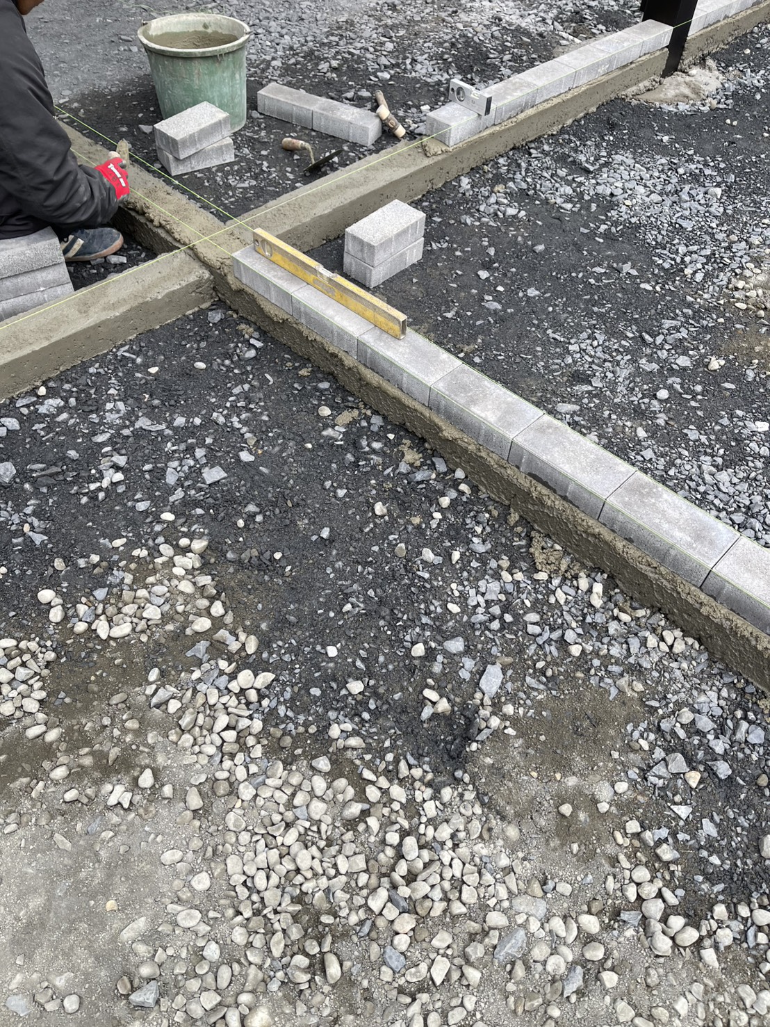カーポート駐車場部分へのインターロッキングの見切りの敷設作業となります。