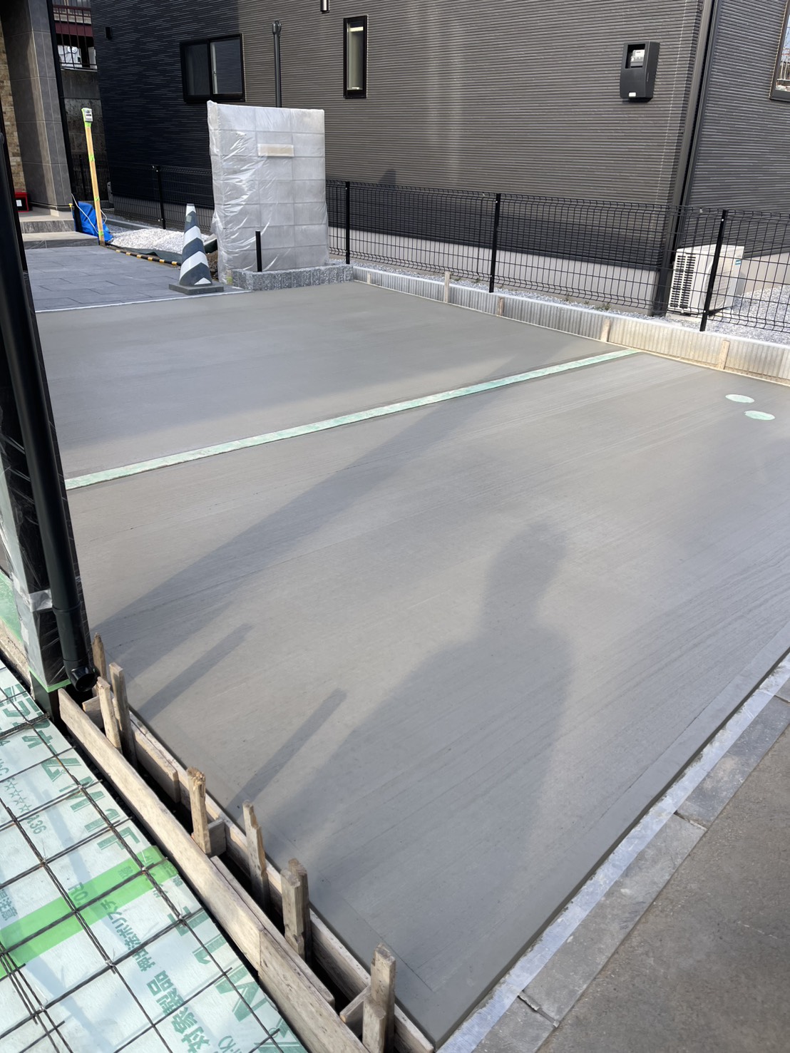 1回目の駐車場部分のコンクリートの打設作業も終わりまして動物避けネットを掛けてコンクリートの養生となります。