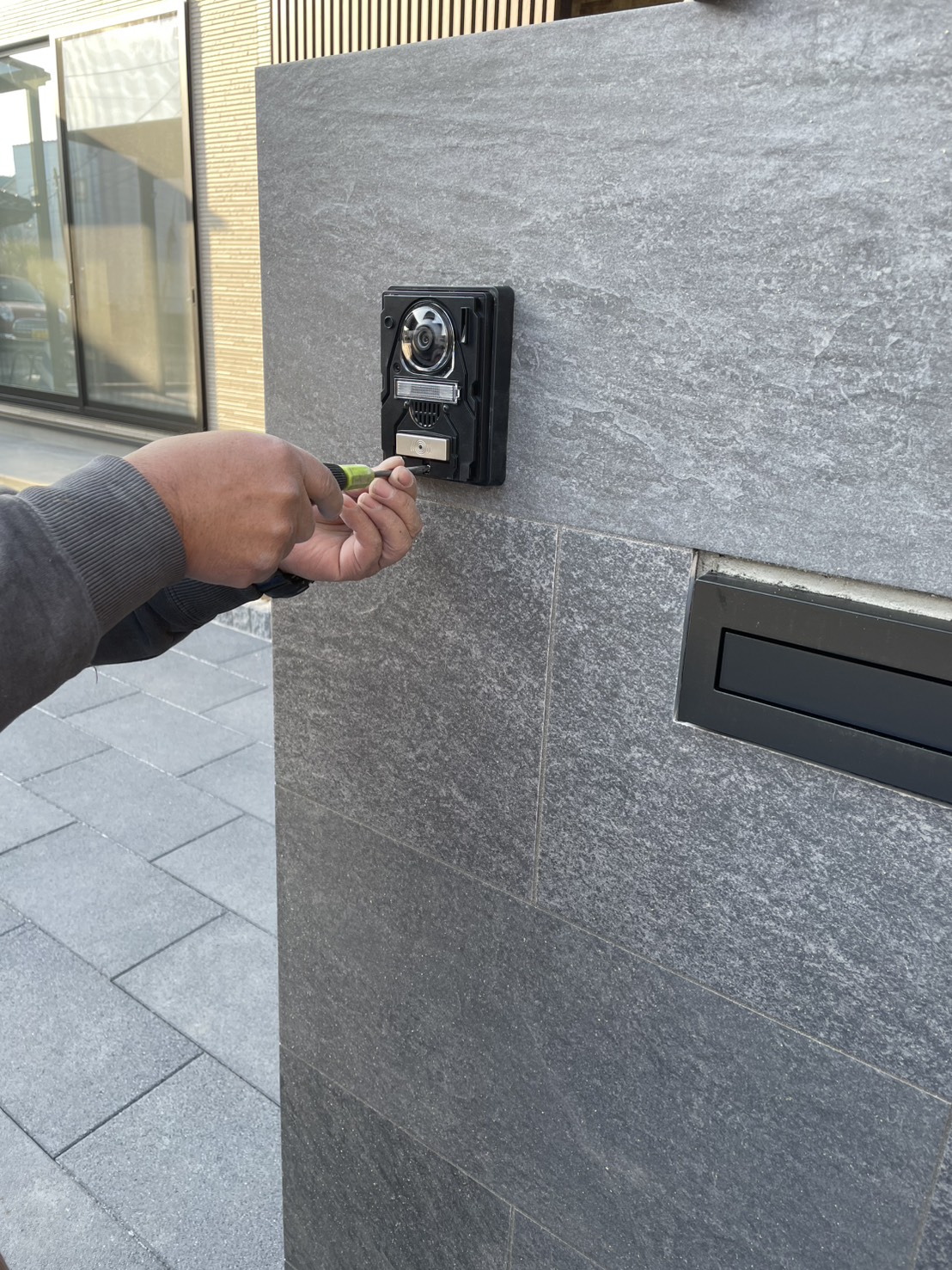門袖のインターホン取り付け作業となります。