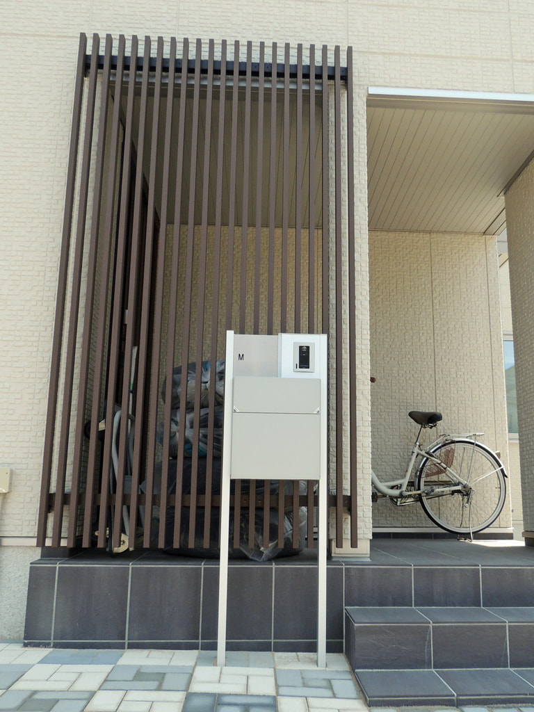 出来るだけ柔らかいイメージの外構をご希望でしたので、塗り壁の門柱を曲線にし、天然石を使用したアプローチとレンガの花壇はR状にごていあんしました。