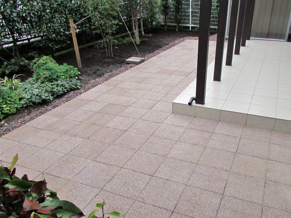 タイルデッキのまわりにインターロッキングを施工して草取りの悩みを解消できるよう提案しました。