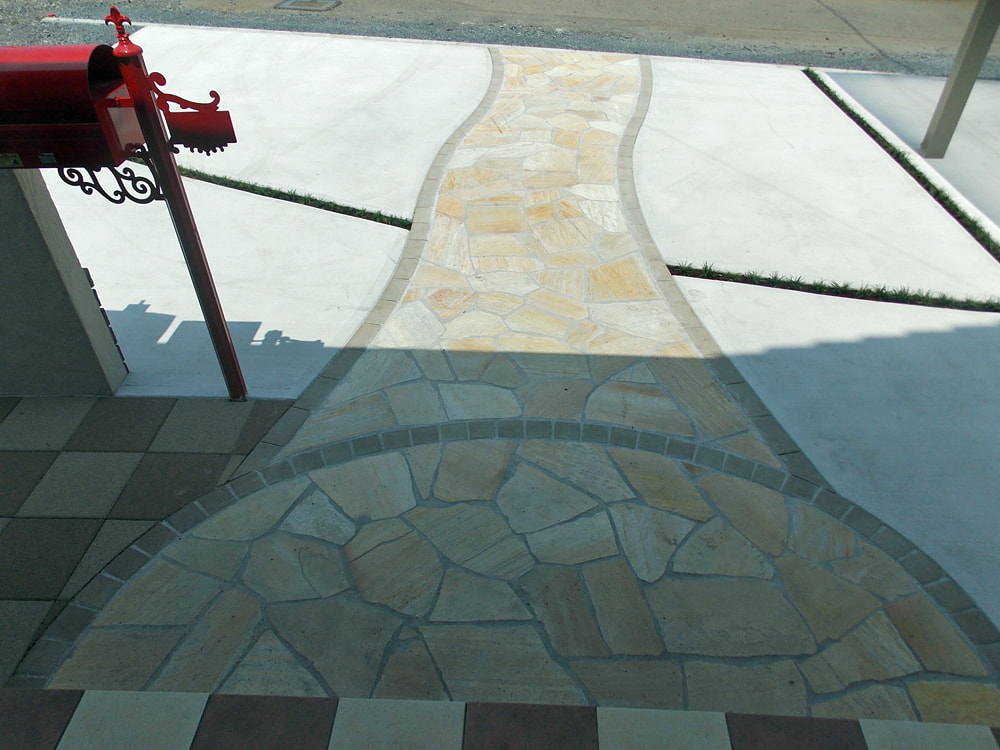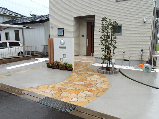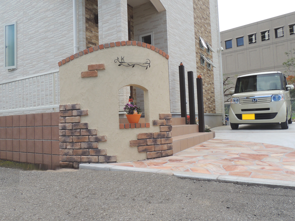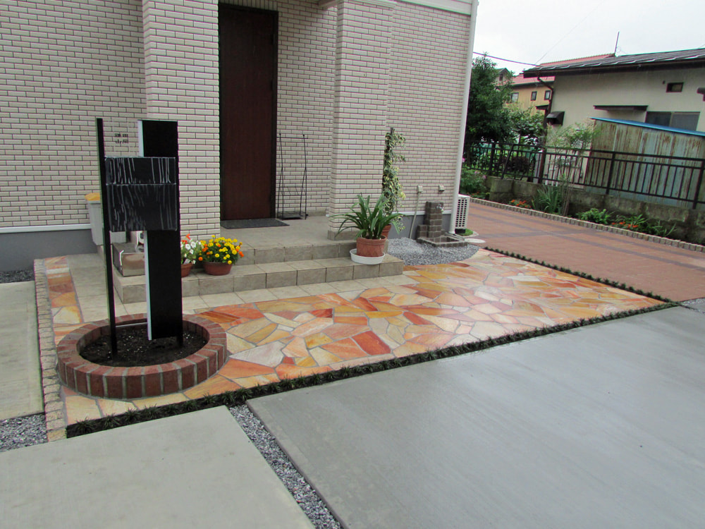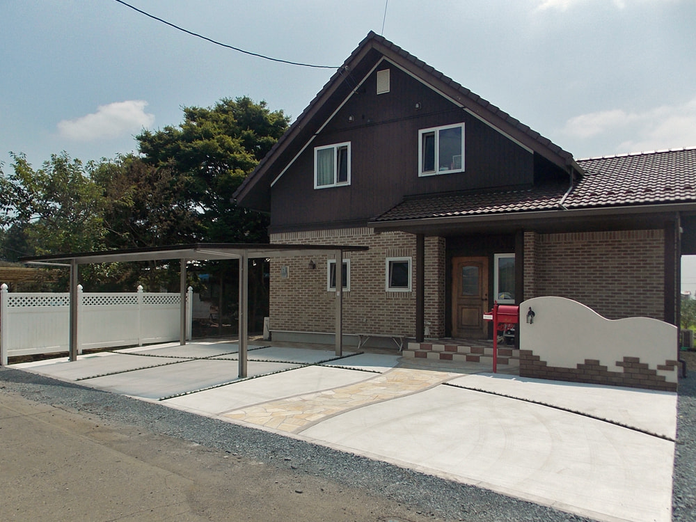 コンクリート駐車場、カーポート、自然石乱張りのアプローチ、レンガを使った門柱