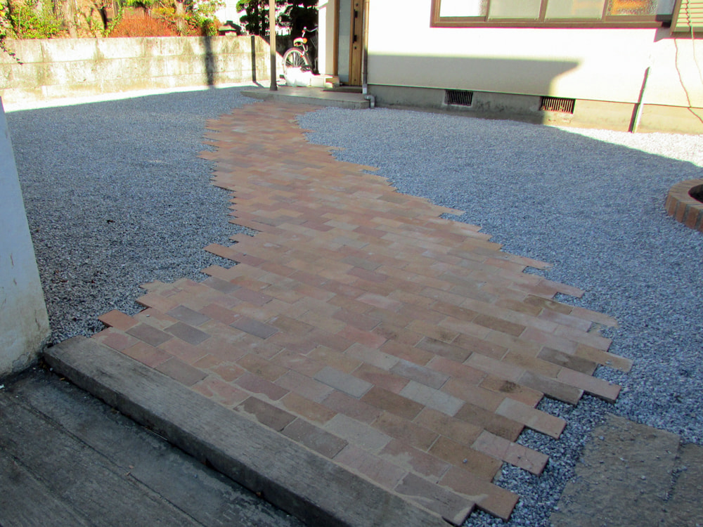 草の生えないお庭をご希望でバーベキュースペースを土間コンクリートにしました。この土間コンクリートの冷たい印象を少しでも和らげるようにアプローチはレンガを使いました。