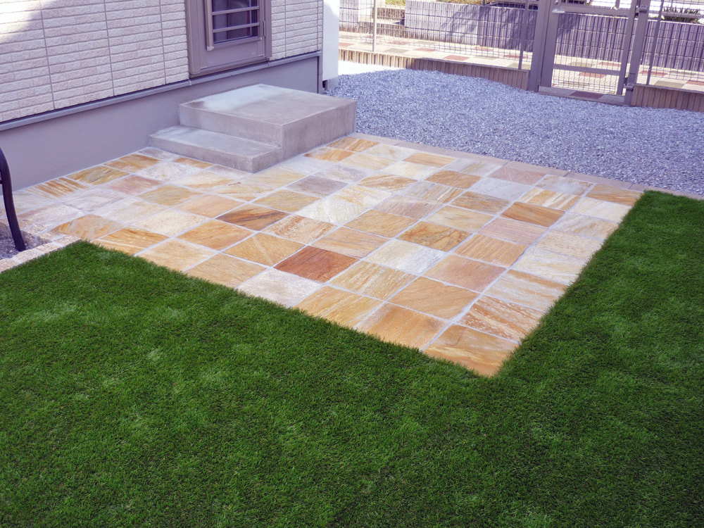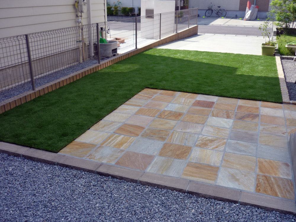 人工芝と砂利の仕切りとして最初はコンクリート縁石を提案致しましたが、お客様が将来的にご自身で花や木を植えたいということで高さや色のあるグラニートに変更しました。