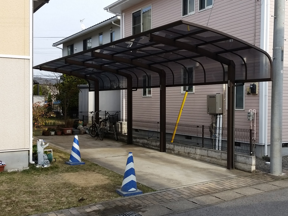 タイル数枚の交換と一段分の交換の違いや、長期の劣化で全体を補修しなければ難しいとご提案しました。カーポートを長期劣化でアクリル屋根が破損してますので改修や交換のご提案をしました。