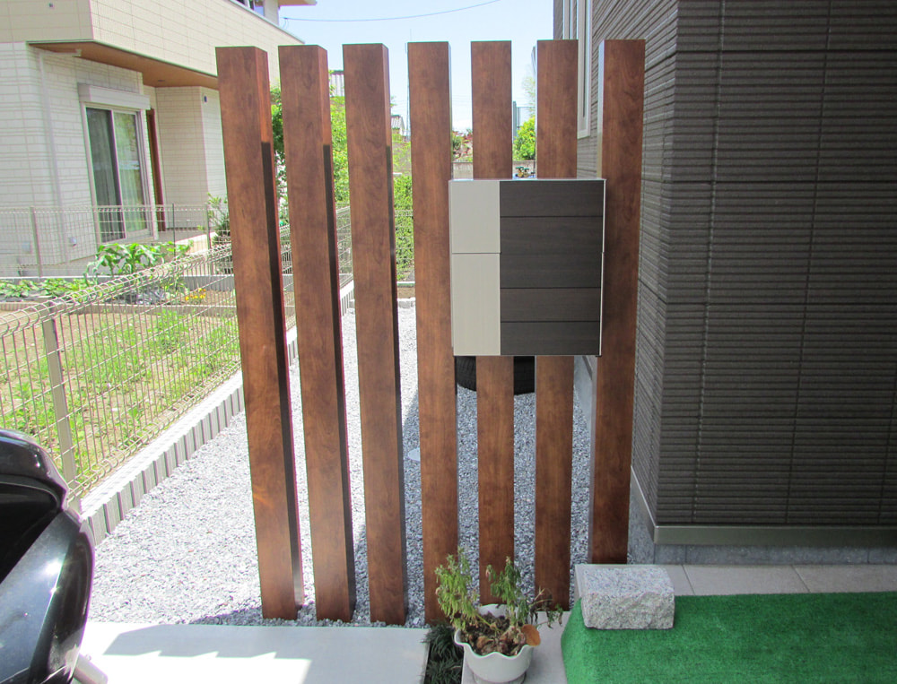 N様の外構は、ご自宅の雰囲気に合わせて、木目調の枕木材とポスト以外はモノトーンを基調とした色使いにしました。