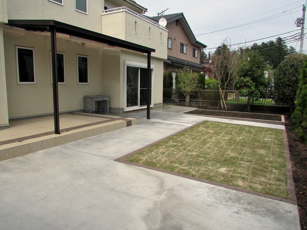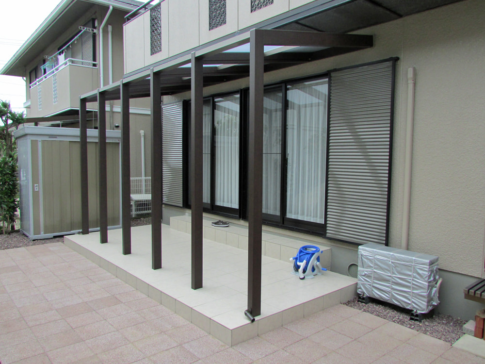 バーベキューコーナーは、マテリアルカラーのテラス屋根を設け、日除けを設置したので快適に過ごせるようにしました。