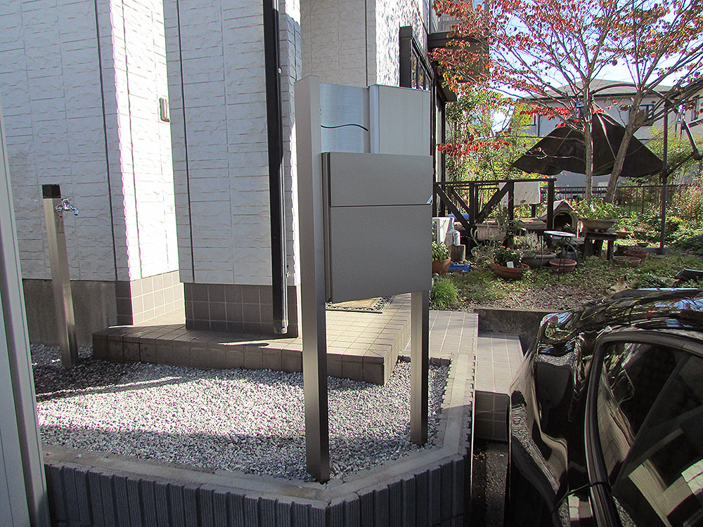車を広々ととめられるように駐車場を拡張し、隣の敷地までカーポートがはみ出さないようにカーポートの位置を細かく決めました。奥様のご希望だった玄関までの階段を新設したときに、ポストの位置を現場で確認しながら一番お気に入りの場所を決めて頂きました。