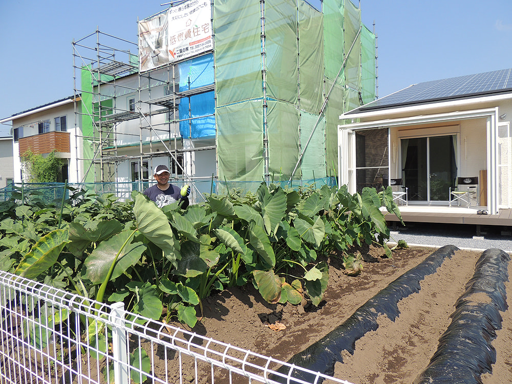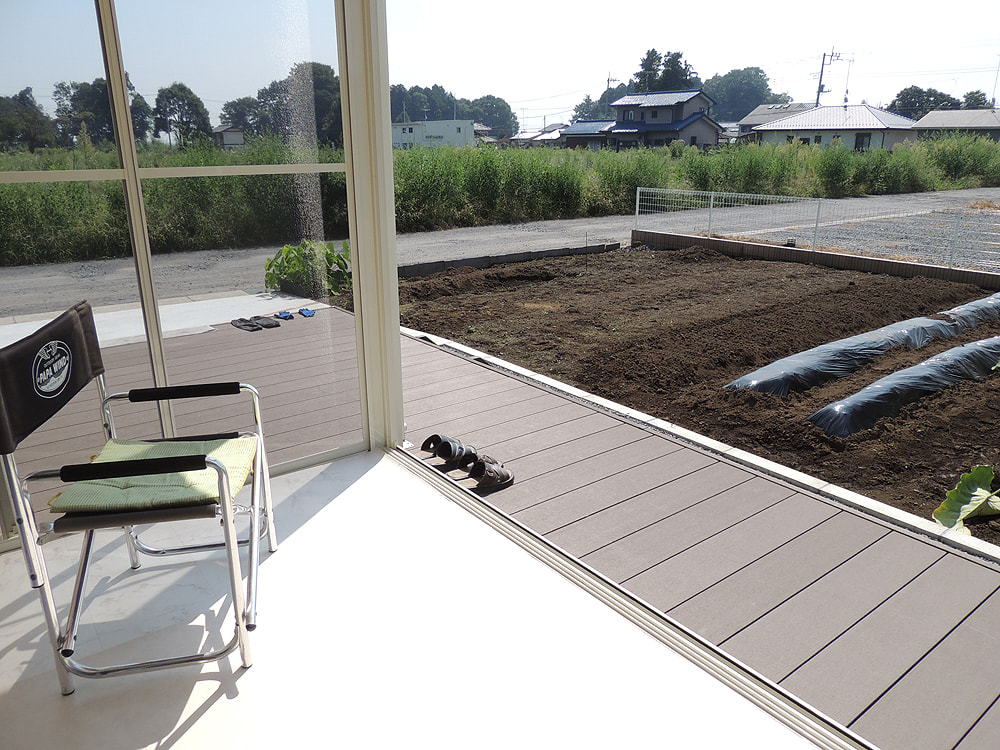 家の前の畑で仕事をするときに休憩できるようにと、広めのデッキとガーデンルームと駐車場・門柱をお願いしました。