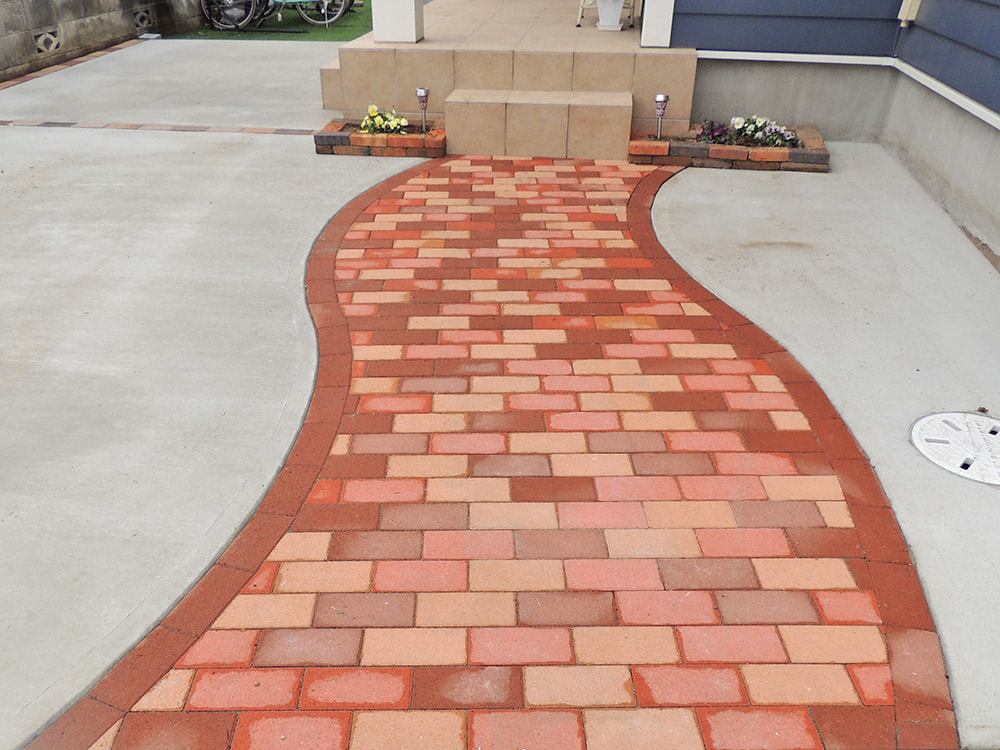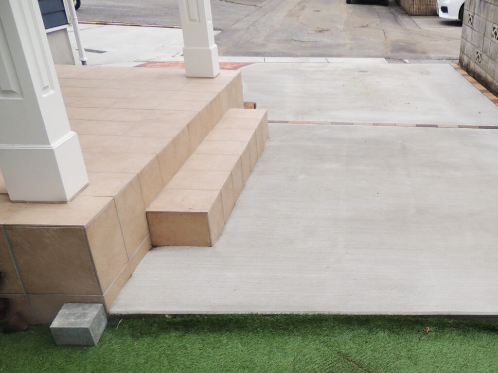 アプローチも駐車場として使用できるように、下地をコンクリート仕様にし、R状のラインで仕上げました。コンクリートの無機質な雰囲気が明るい仕上がりになりました。