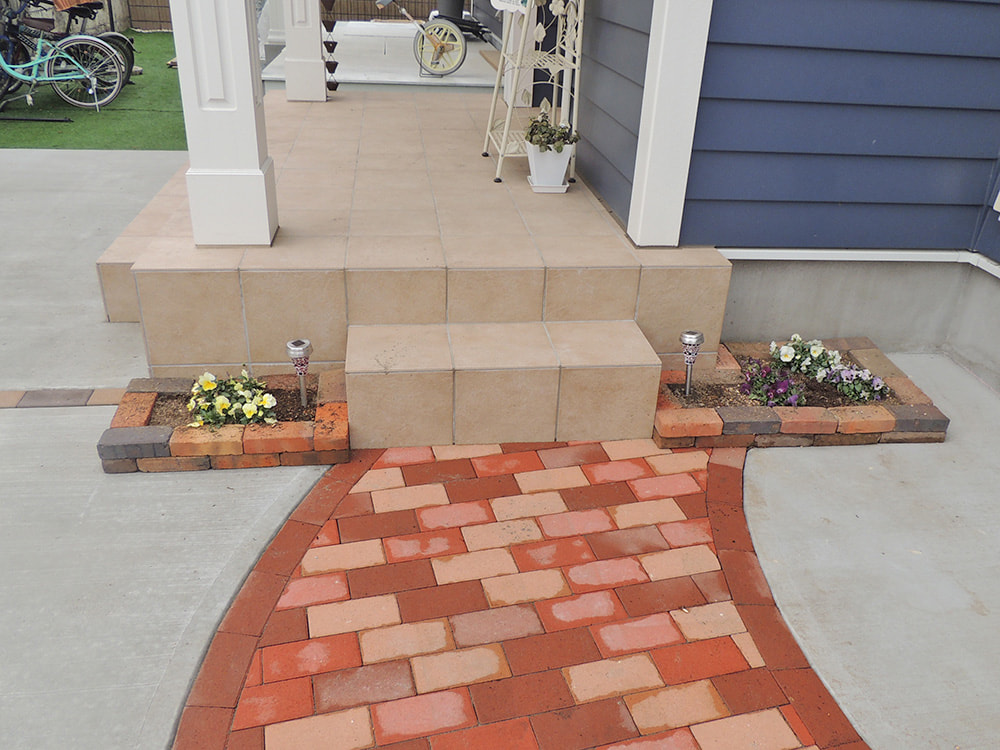 今回の工事前に使用していたレンガを使い、玄関の階段わきに花壇を作りました。