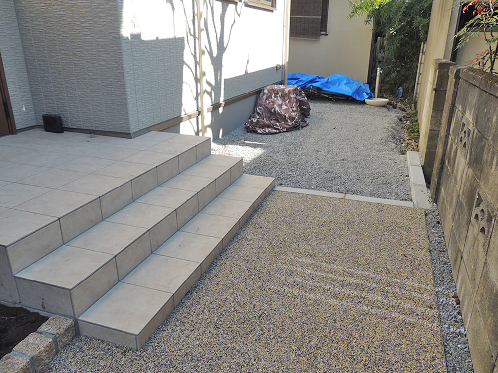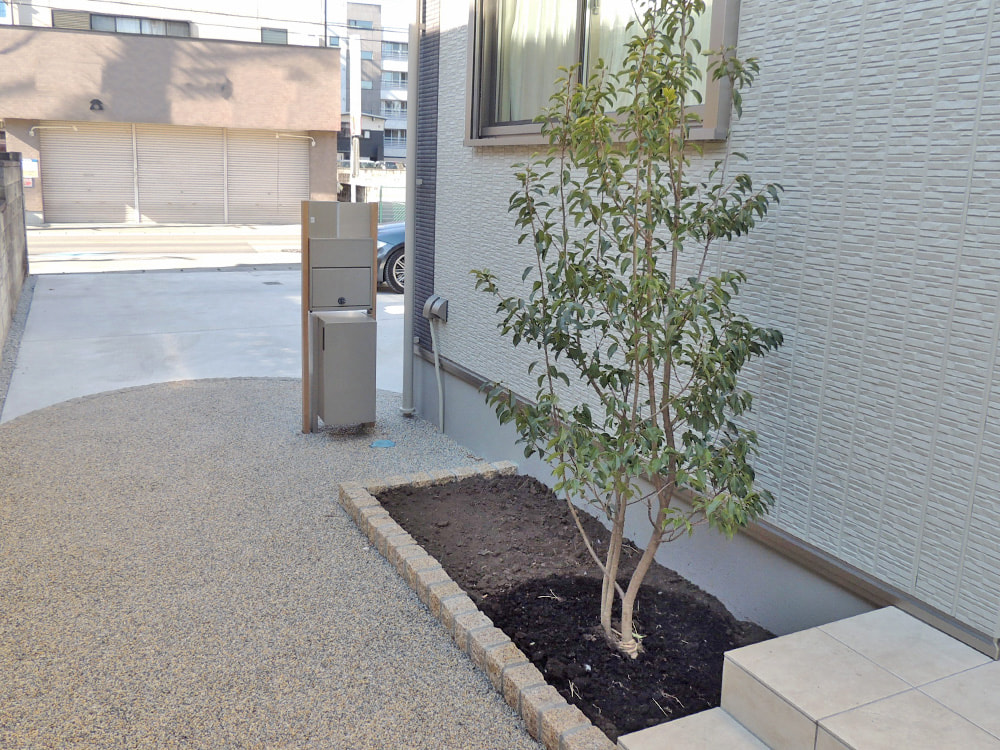 全体的にモノトーンでまとめてみましたが、アプローチ脇に花壇を作りお客様を迎える玄関までの距離がアクセントになりました。また、お子様が幼いのでお手入れは大変かもしれませんね。