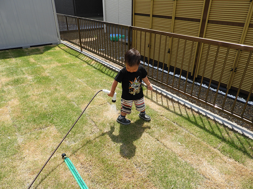 タイルデッキと芝の境目が思っていた以上にきれいに仕上がっていました。これからは個度をプールで遊ばせたいと思っています。