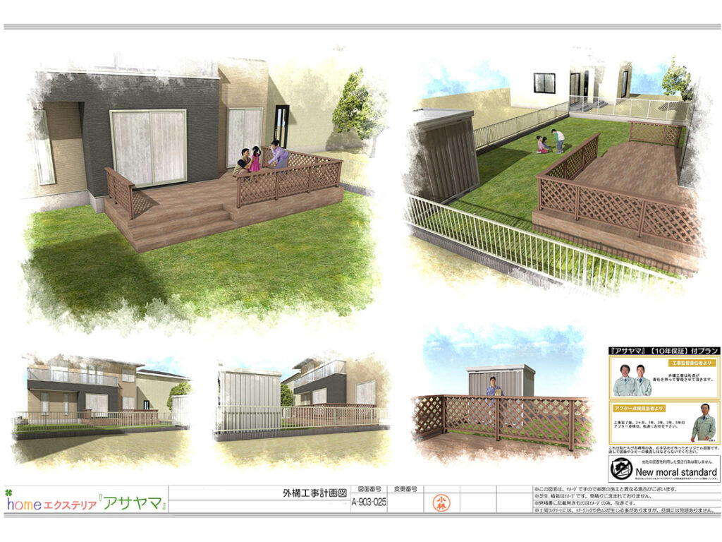 広い庭なので子供が遊べるように芝を広めにしてもらいたいと要望しました。タイルデッキは木彫で希望のものがあったのでお伝えしました。