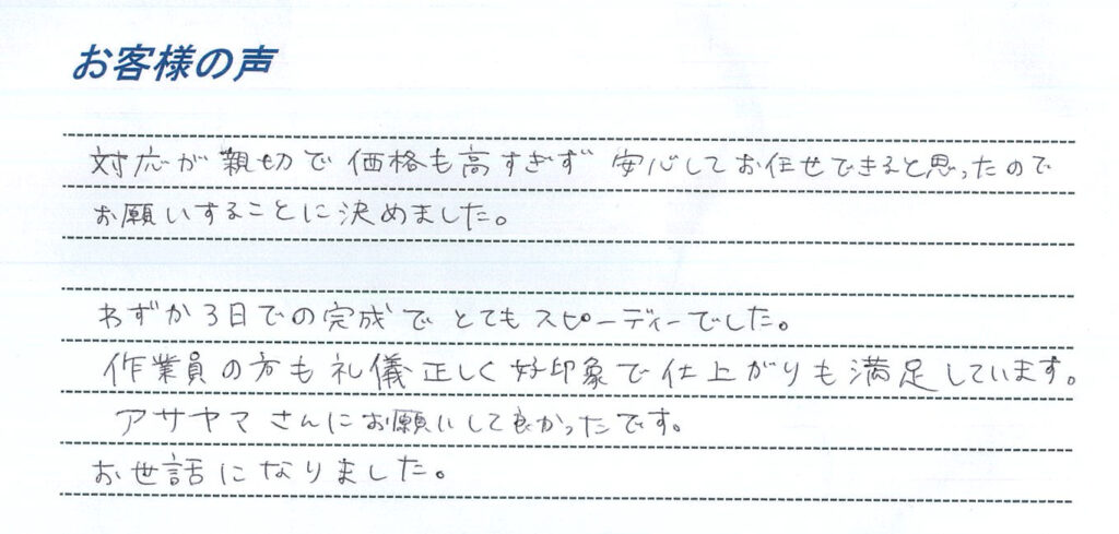 工事完了後は大変うれしいお言葉を頂きありがとうございます。