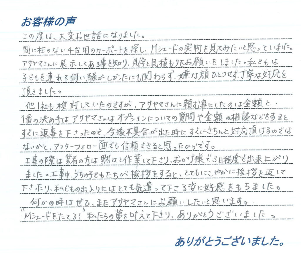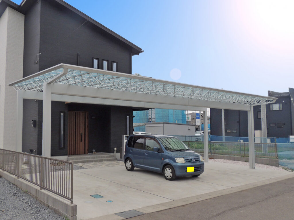 工事完了後につきまして、ご満足のお声を頂き大変うれしく思います。ありがとうございました。K様ご家族の夢の実現のお手伝いをさせていただけた事に私たちも大変光栄に思います。ゆったりとした4台用のカーポートですので、安心して駐車ができると思います。今後ともどうぞよろしくお願いします。