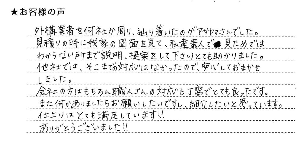 ご満足した頂けたとのお言葉を頂き大変嬉しく思います。梅雨時期の為に少し工期が長くなり申し訳ございませんでした。奥様のご希望で設置したアメリカンフェンスはとても素敵で建物とマッチしていますね。これからもお客様に満足していただけるように努力したいと思います。今後ともよろしくお願いいたします。