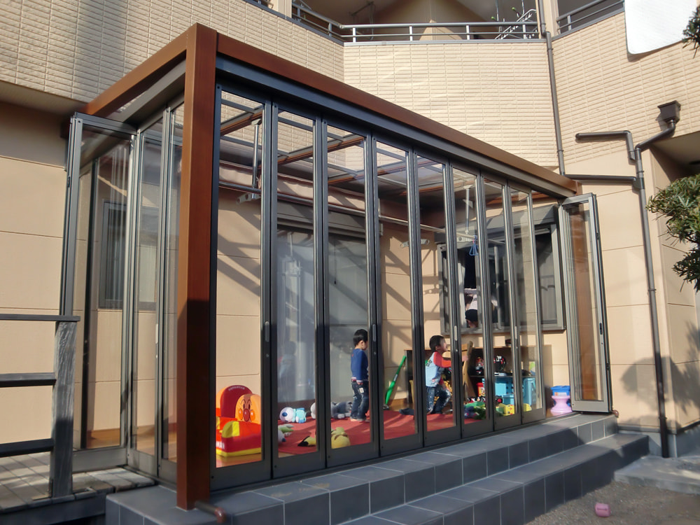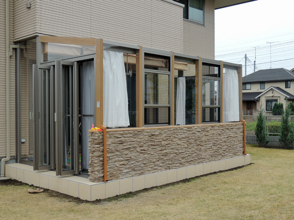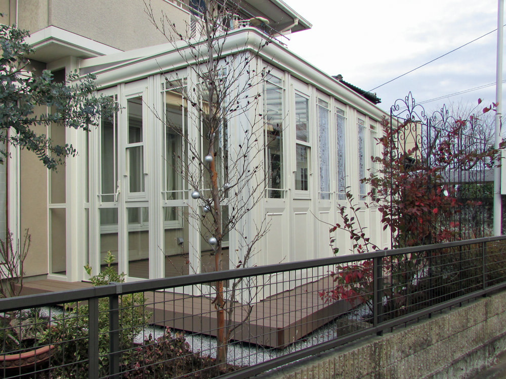 2間×9尺と広々としたガーデンルームGF。お客様のご要望からプランさせて頂きました。お隣の目線が気になる側面は腰壁で隠し、開放感を取りたい正面は全面開口が取れる折れ戸をご選定頂きました。出来栄えを大変気に入って頂いて、私もとても嬉しく思います。洗濯干し場、お子様の遊び場、ご家族、ご友人との団欒の場としても重宝します。季節折々の風情を楽しみながら非日常空間をお楽しみください。