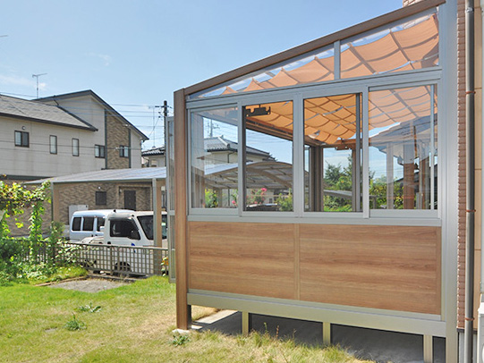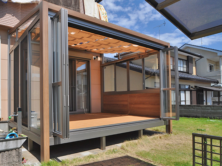 既存のウッドデッキが古くなり見た目も悪くなってきたので、洗濯物干しや趣味の場所として使えるガーデンルームを探していました。