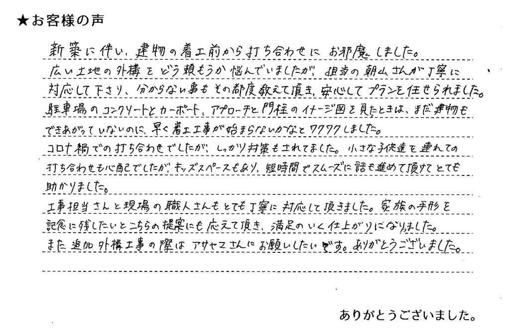 この度は工事のお依頼を頂き誠にありがとうございました。ご満足して頂いたとのお言葉を聞き、私共も大変嬉しく思います。こちらこそ、コロナ禍にも関わらず来店頂き、お打ち合わせを進めさせて頂き本当にありがとうございました。今後ともどうぞよろしくお願いします。