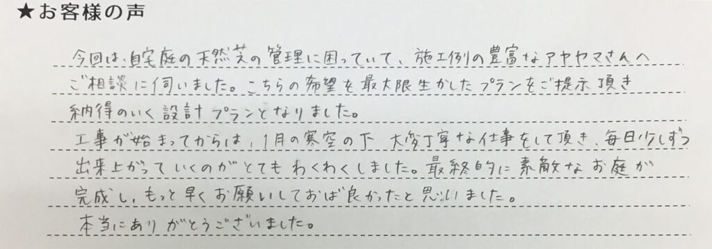 この度は、ご満足していただけたとのお言葉をお聞きし、大変嬉しく思います。ありがとうございました。これから春を迎えお子様もお庭で遊ぶことが増えると思いますが、家族でバーベキュー等も楽しんでいただけたらと思います。これからもよろしくお願いします。