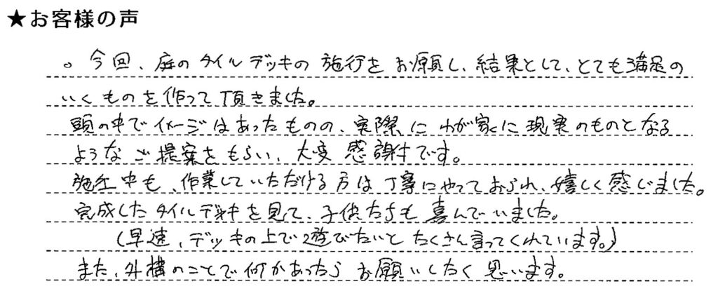 以前に外構工事を施工させていただきました。そしてこの度はタイルデッキをご依頼くださいました。