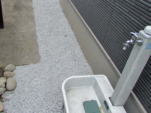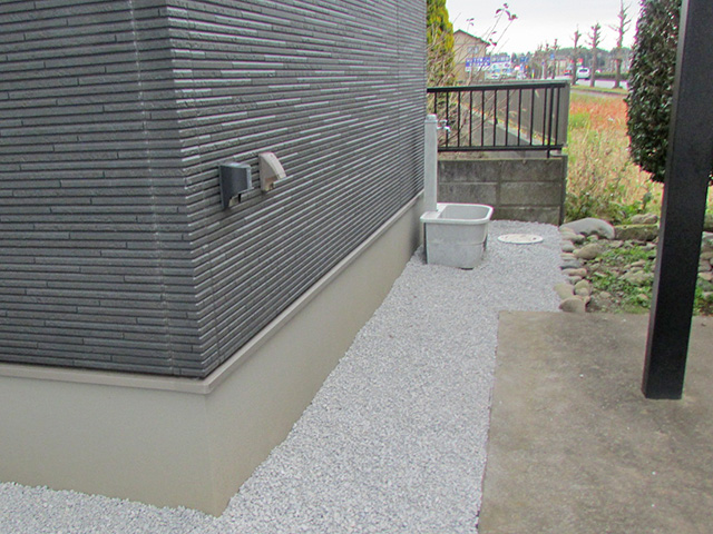 建物まわりは、防草シートを敷き、砕石を敷きつつ、汚水マスとの高さを揃えました。
