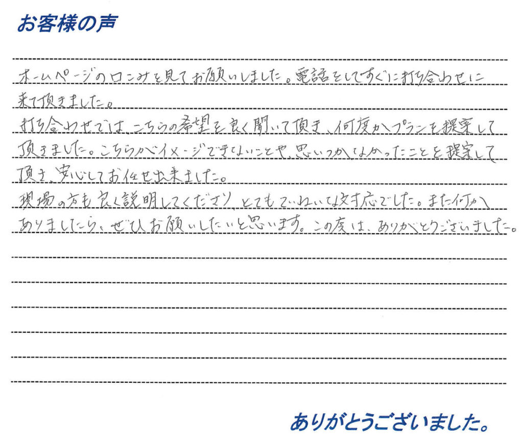 ご満足して頂き、大変うれしく思います。色を決める際には、ご両親と息子さんなど全員で楽しく決めて頂いたことが印象的でした。今後も何かございましたらお気軽に連絡ください。急いでお伺いします。