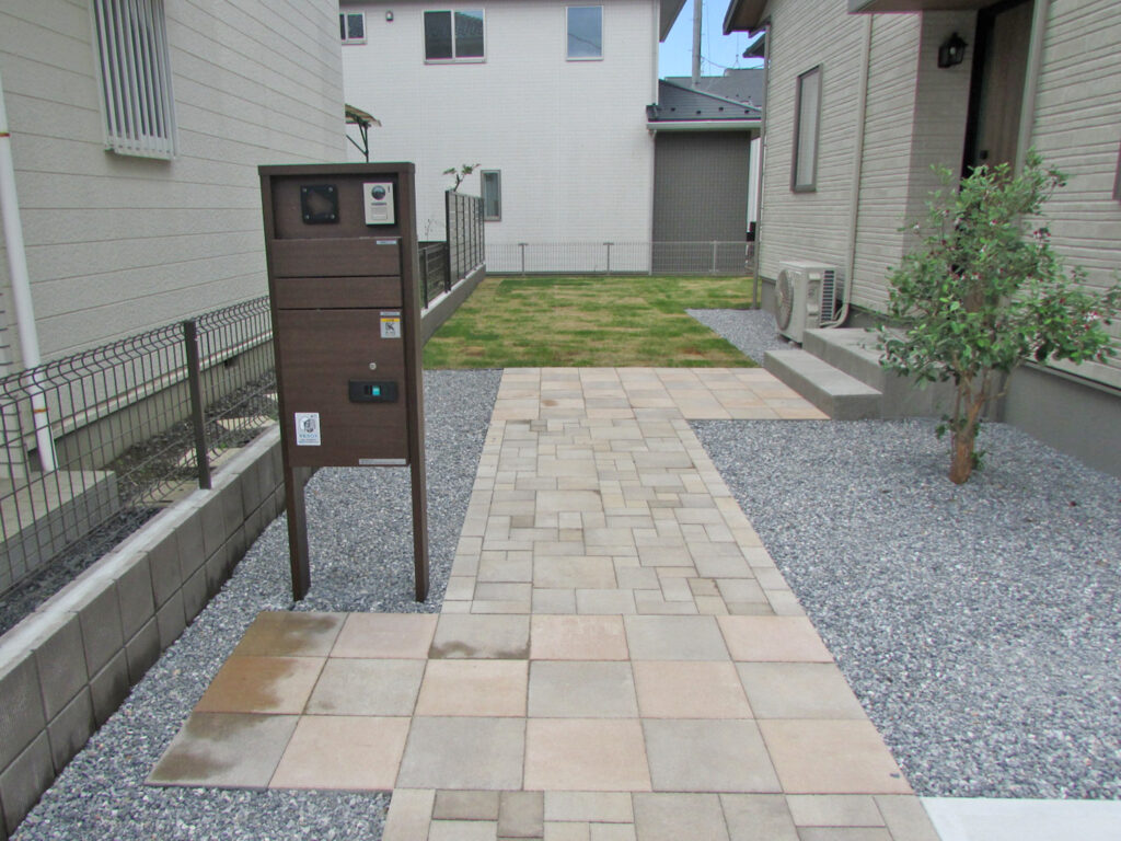 アプローチはインターロッキングを敷き門柱は宅配ボックス付きの機能門柱で不在時の荷物の受け取りも安心ですね。