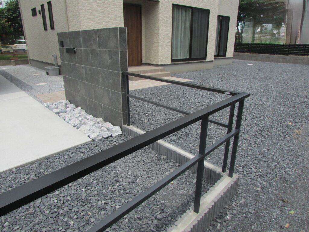 外構の色合いは建物のサッシに合わせでブラックにしました。