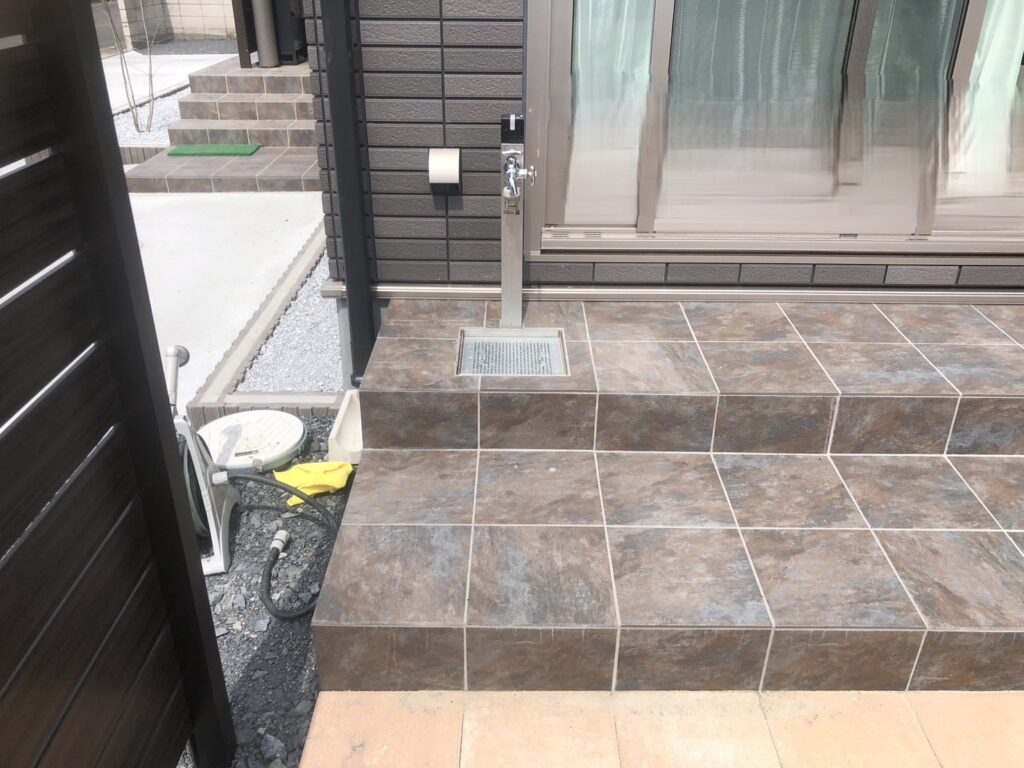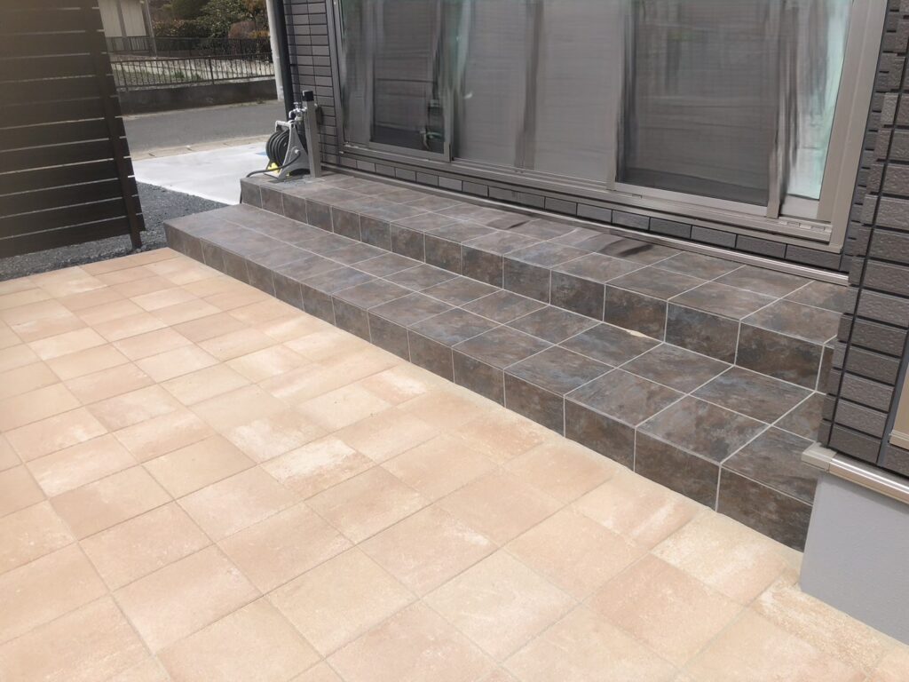 タイルで階段を作り、インターロッキングでタイルデッキを延長したようなデザインにしました。