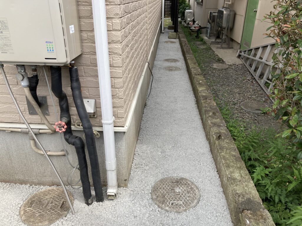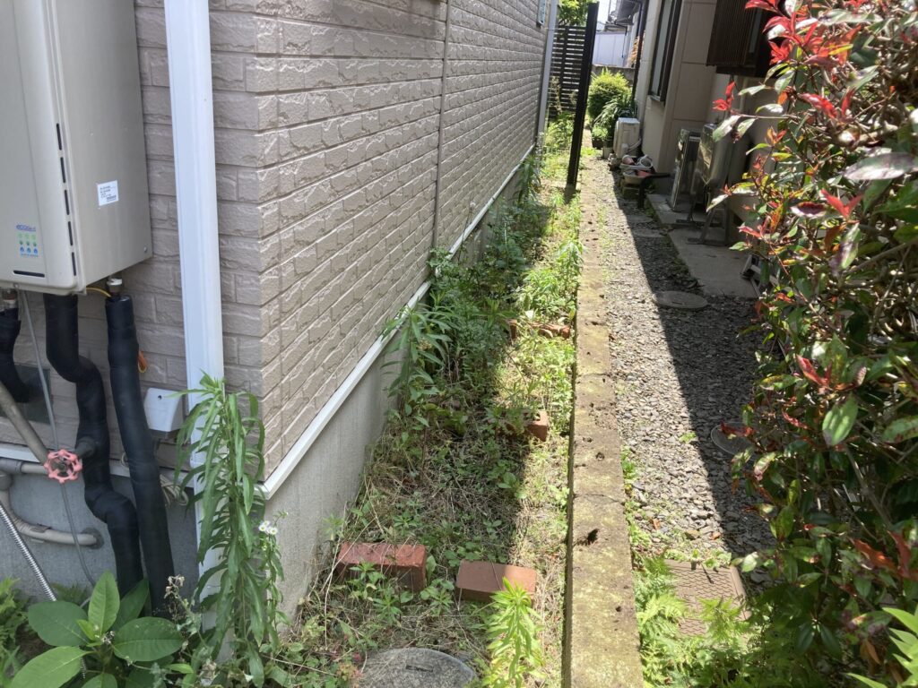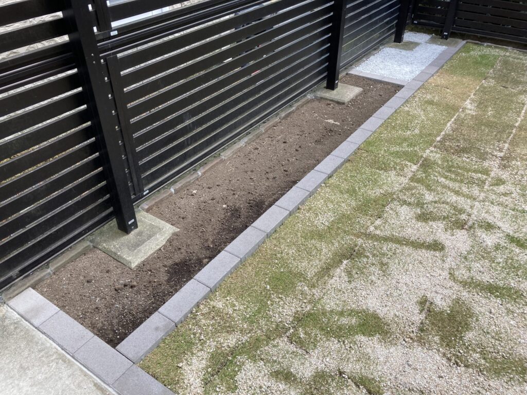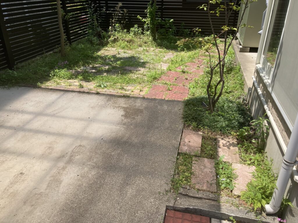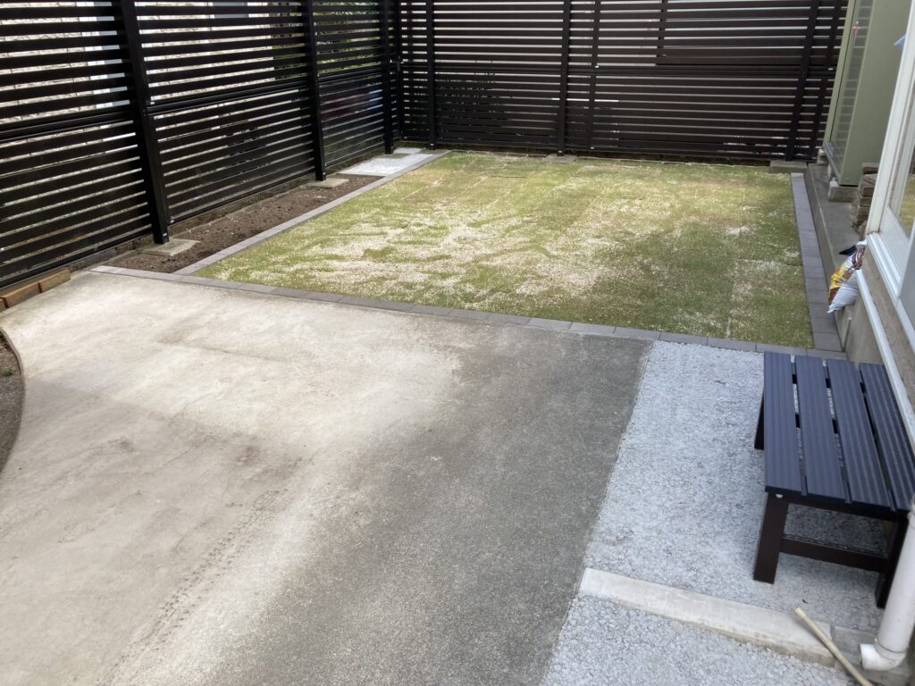 中古物件を購入しお家の中はリフォームしたのですが、外回りは後になってしまったそうです。お庭はきれいに整備して芝は貼りました。一部花壇としてスペースを残しています。お家廻りは雑草対策として浸透性コンクリートを施工しています。