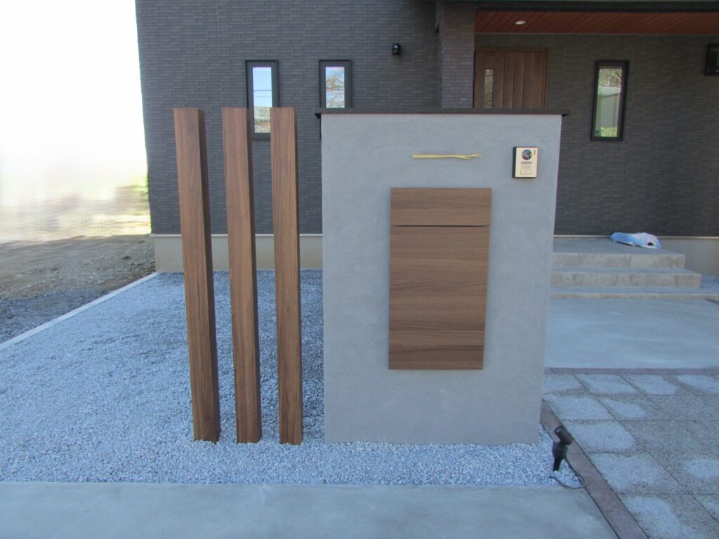 木目調が特徴の宅配ボックスと塗り壁の色合いが綺麗です。