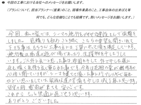 ジーマの内部仕上げはフローリングをご希望でしたので、床下地組みをしっかりし、断熱材、コンパネを捨て張りし、フローリング材で仕上げましたので、冬も暖かいと思います。実際、施工後2月中旬でしたが、中は暑いくらいでした。