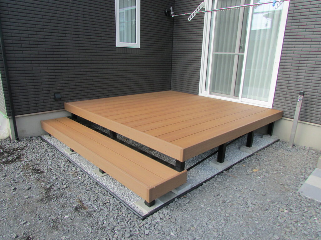 樹脂デッキにはステップも設置しお庭への行き来も楽になりました。
