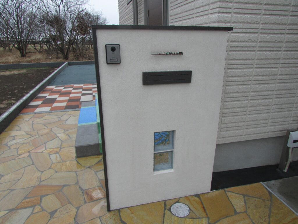 塗り壁の門柱にはガラスブロックが埋め込まれています。