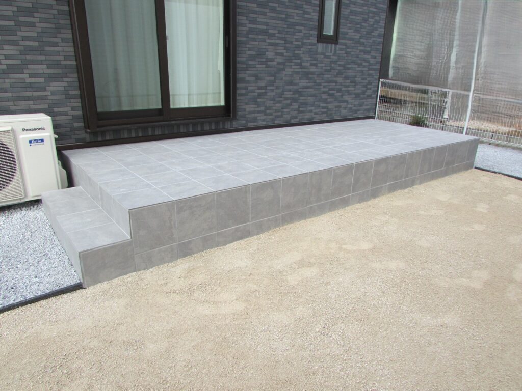 お庭は畑スペースを残しつつ、人工芝スペース・タイルデッキ・物置を設置しました。