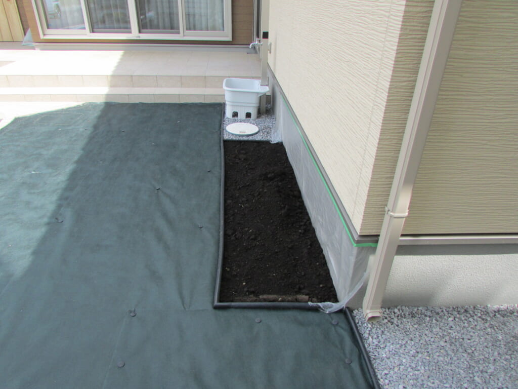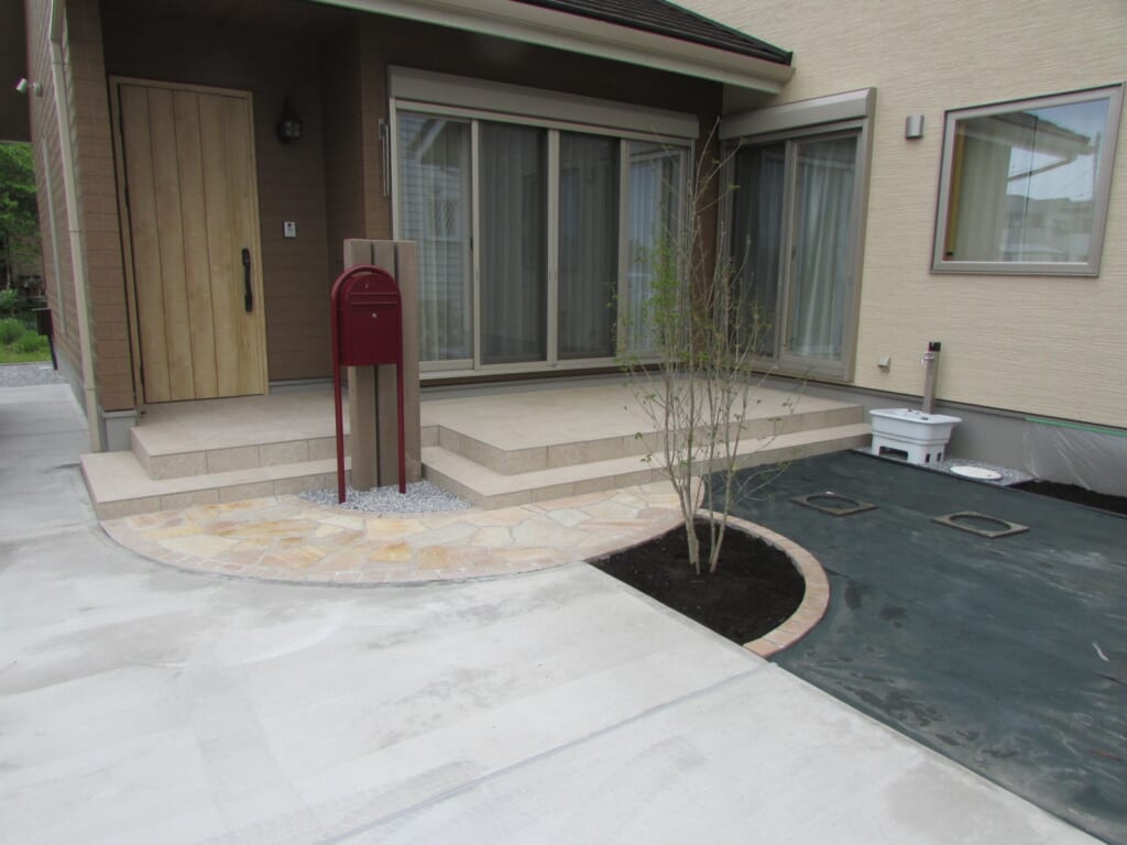 アプローチは道路まで延ばさず、玄関周りを円を描くように天然石を取り入れました。