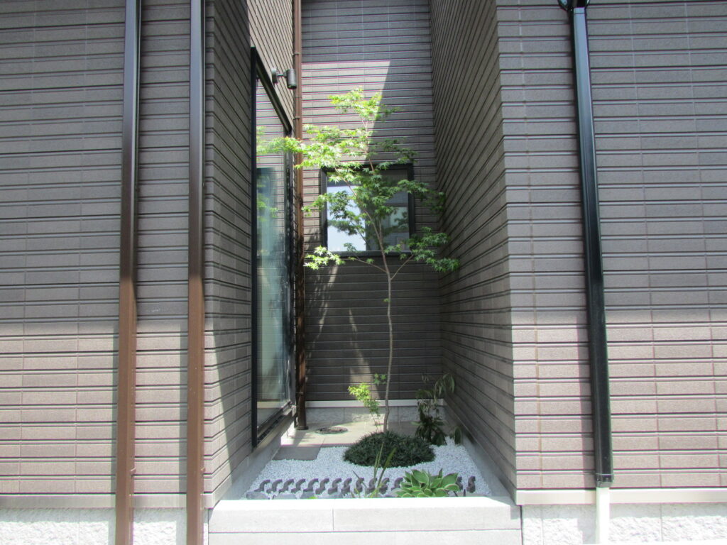 室内からも植栽を眺められる箇所もあり、中からも外からも楽しめるお庭にしています。