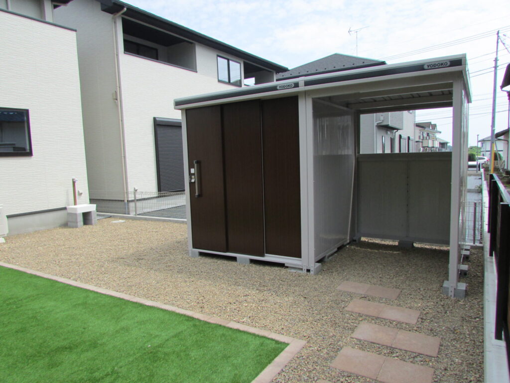 門扉から物置までの動線には300角のインターロッキングを敷き道のように見せています。