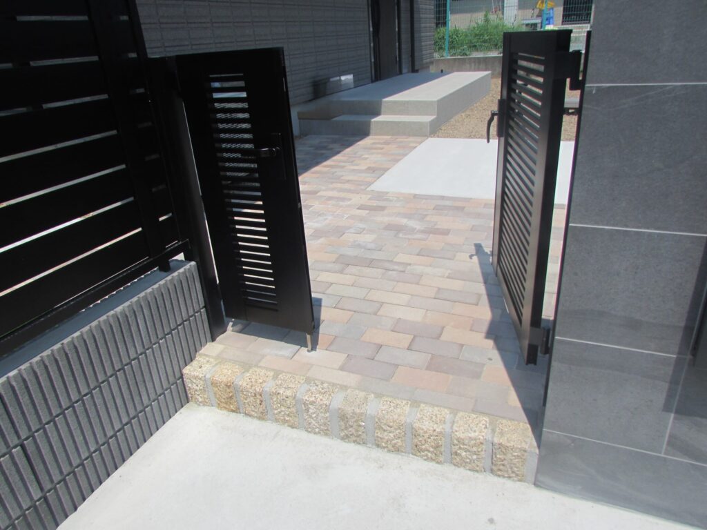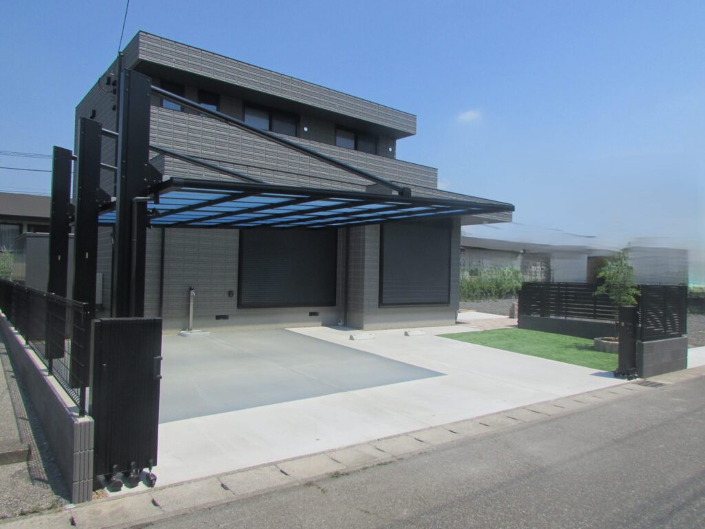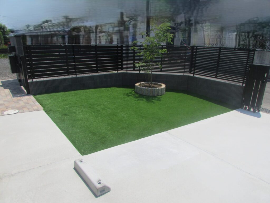 アルミフェンスは車の出入りで見えずらくならないよう場所によって格子幅の違うフェンスを設置しました。