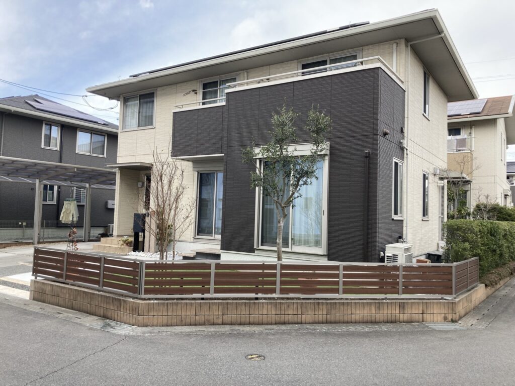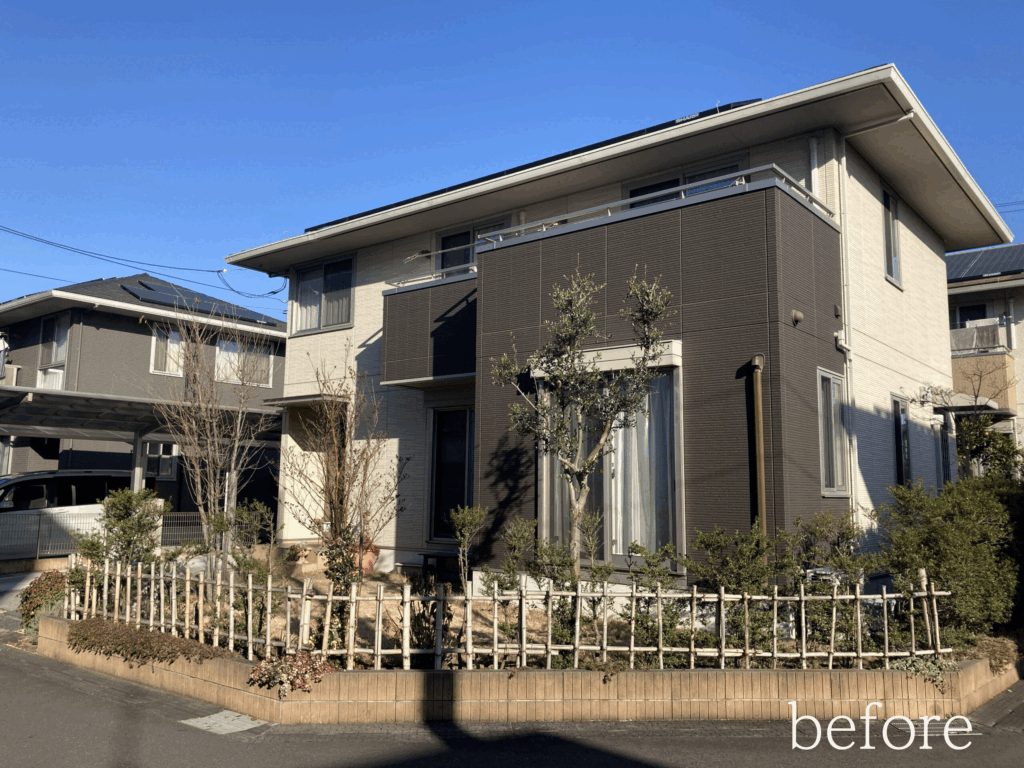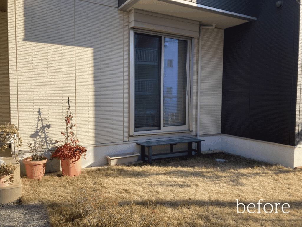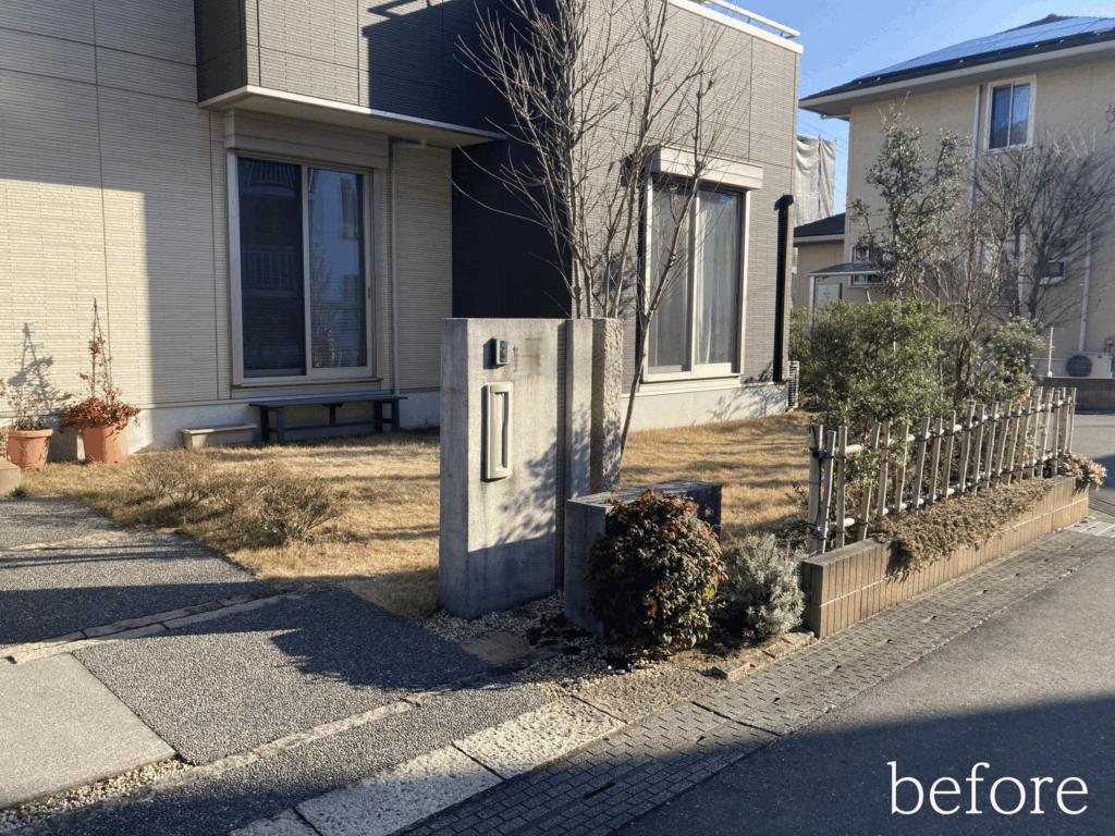 お庭は中木だけ残し全て撤去。生垣の代わりに木調のある目フェンスを設置して固くならないイメージとしました。地面は手間のかからない人工芝しました。