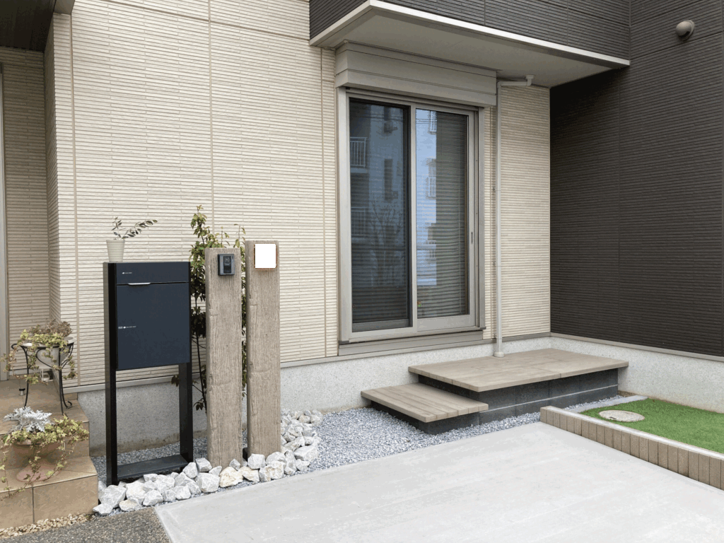 駐車場を増設することによって門柱がなくなってしまうので新規に宅配ポストの設置とコンクリート製擬木にインターホン・表札を移設しました。