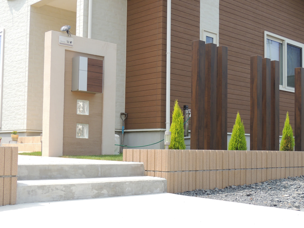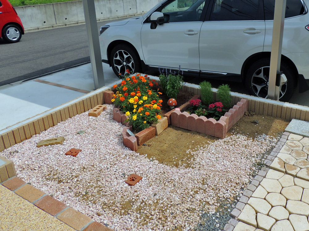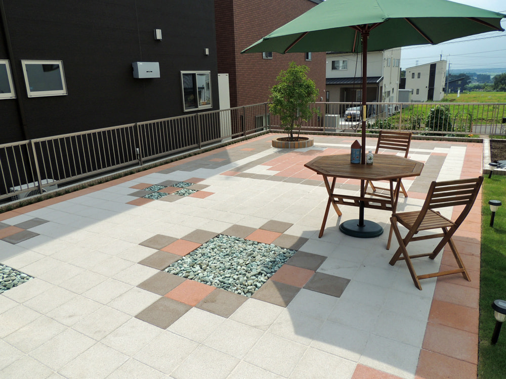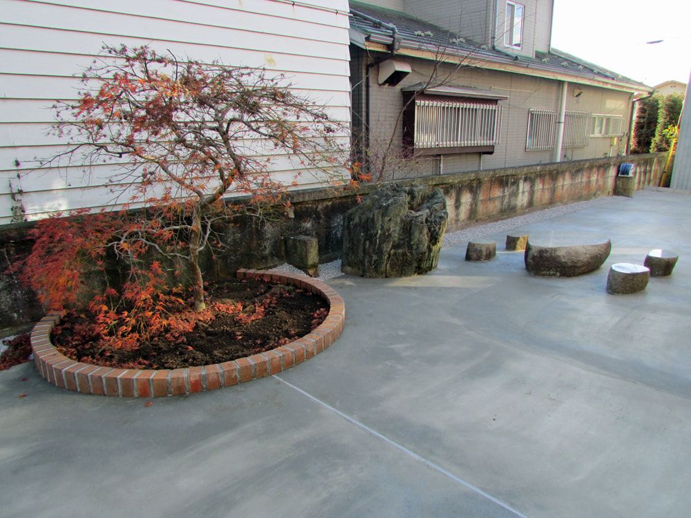 お庭がとても広かったので、半分を300角平板を敷き、バーベキューやお茶を楽しむスペースを確保し、お友達を呼んで楽しめるお庭をご提案しました。