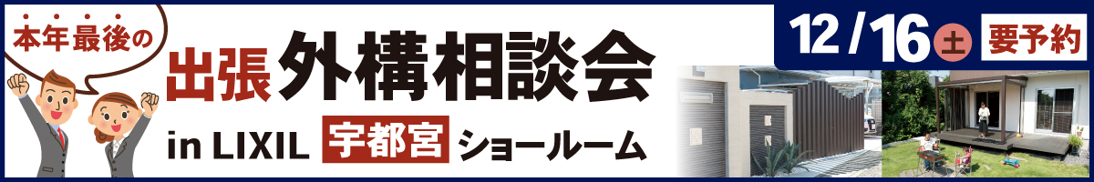 お待たせ致しました!毎回大好評の出張外構相談会を12月16日(土)に、LIXIL宇都宮ショールームにて開催致します。当日は、アサヤマの経験豊富なプランナーが、外構のお悩みに何でもお応え致します。「庭に目隠しがほしい」「家を建てたけど外構が手つかずで」など、どんなことでもOK。新築・リフォームを問わず、お気軽にご相談ください。お客様のご自宅の敷地図・配置図や現状のお写真などがあれば、より詳しくご相談いただけます。4組限定・予約制のため、すぐに埋まってしまう時間帯も。予約はお早めに!
