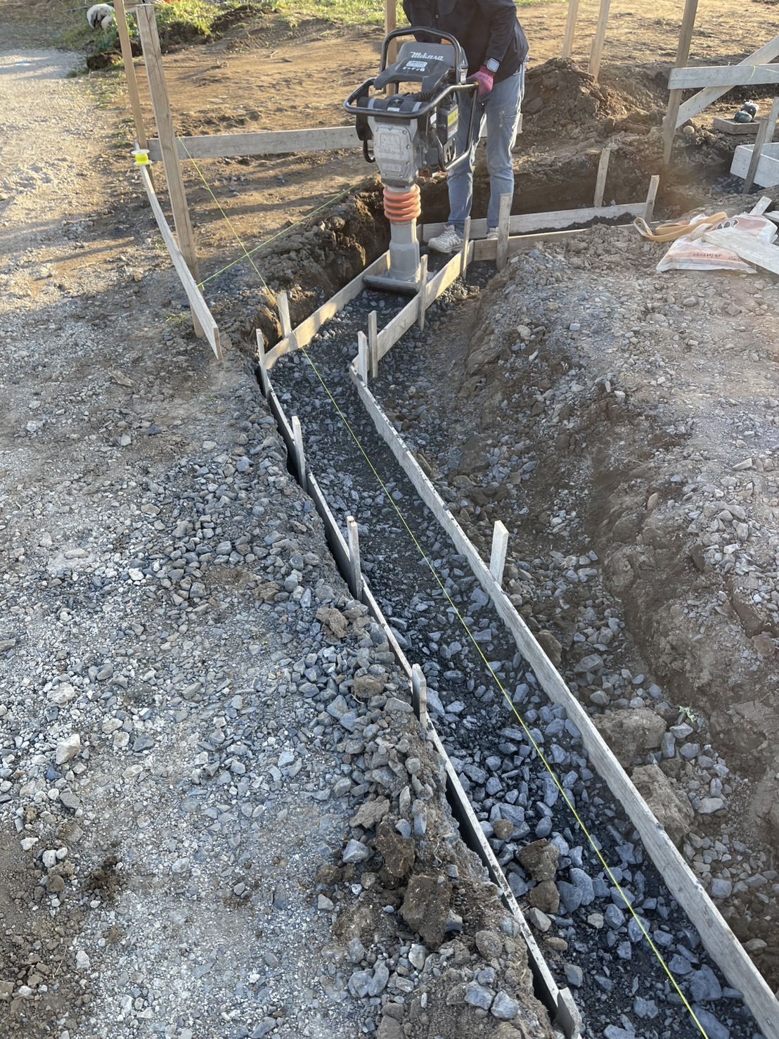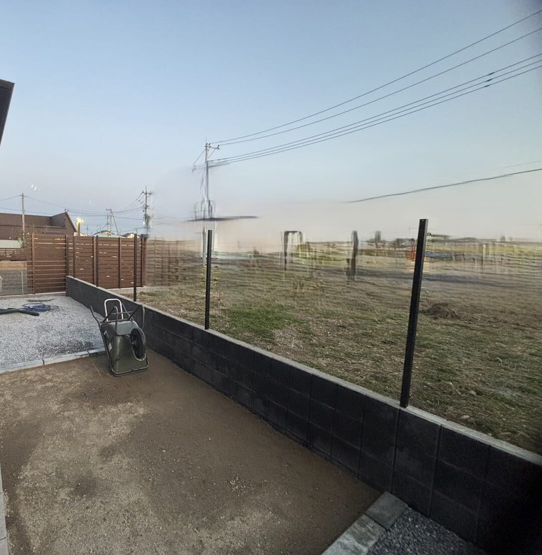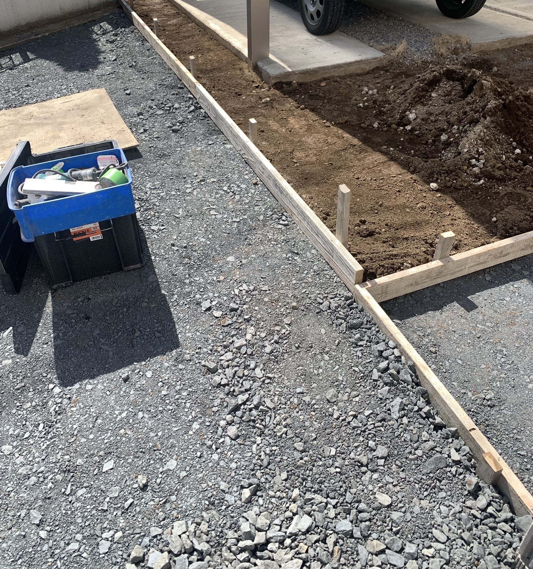 新築の外構工事です。ガレージ・カーポートを施工します。駐車場もお車の出入りを考え舗装範囲や位置を決めました。 工事着工です。よろしくお願いいたします。
