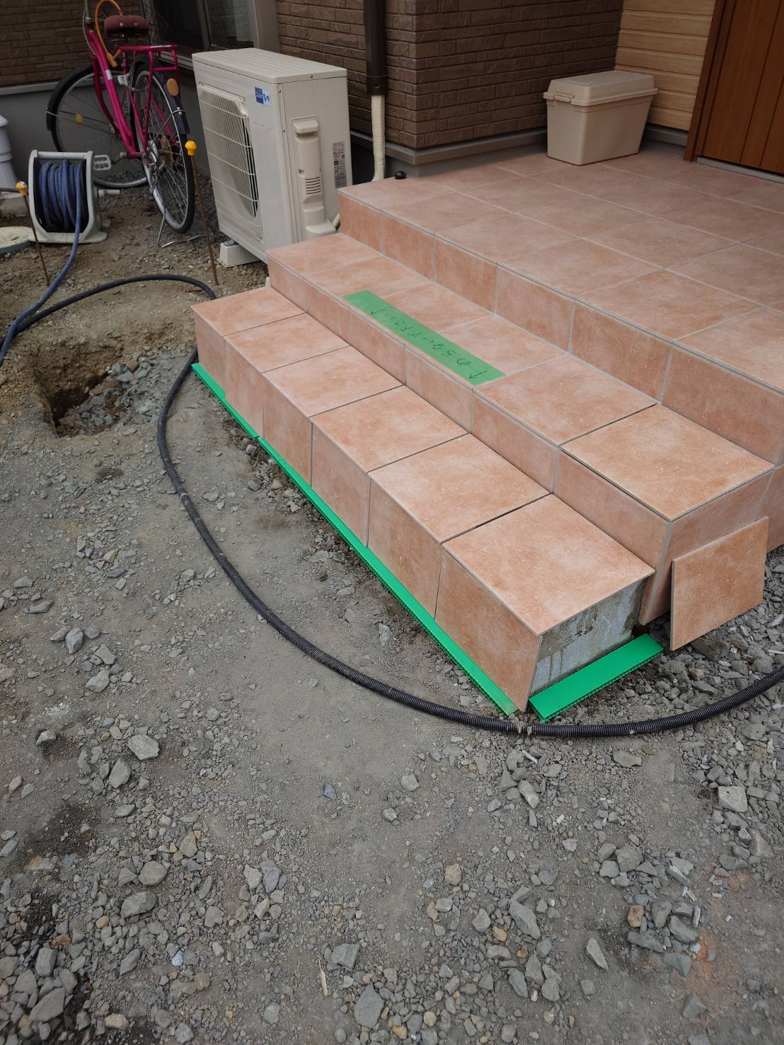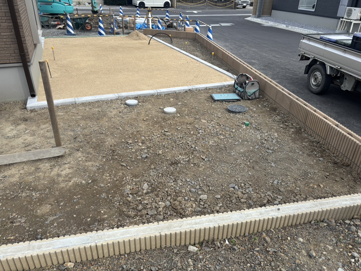 駐車場やお庭舗装の工事となります。 カーポートは折板屋根のLIXIL:カーポートSWで木目調の化粧枠を取り付けました。 他にも手摺なども設置しました。