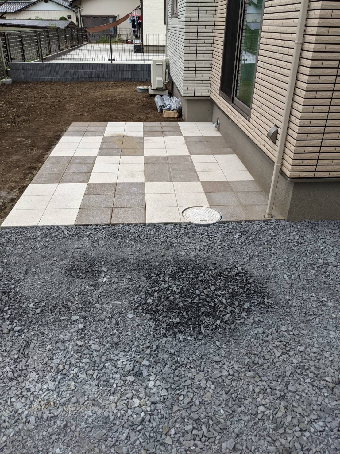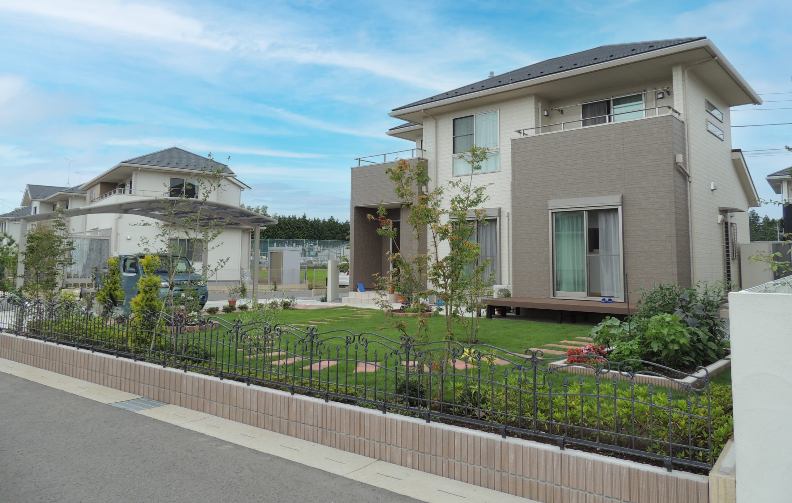 駐車場やお庭舗装の工事となります。 カーポートは折板屋根のLIXIL:カーポートSWで木目調の化粧枠を取り付けました。 他にも手摺なども設置しました。