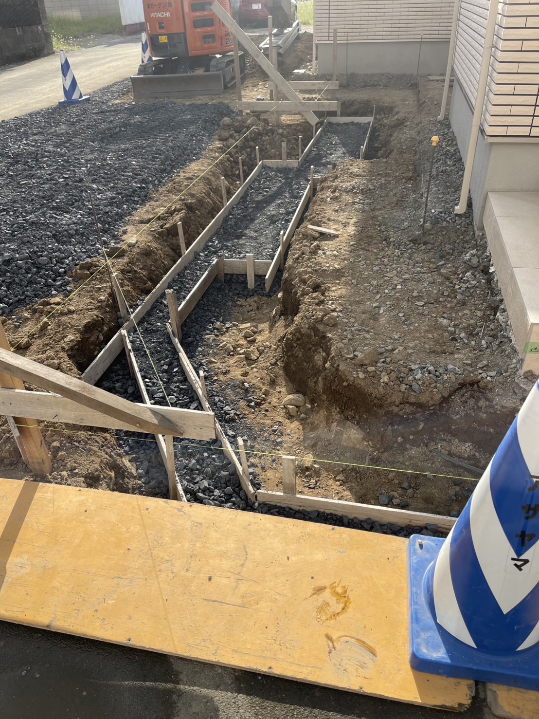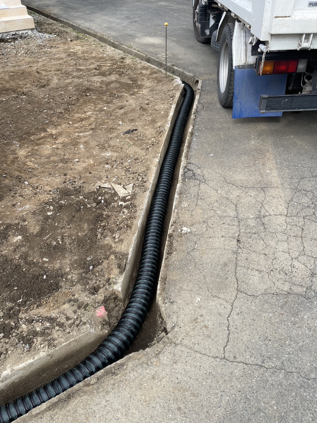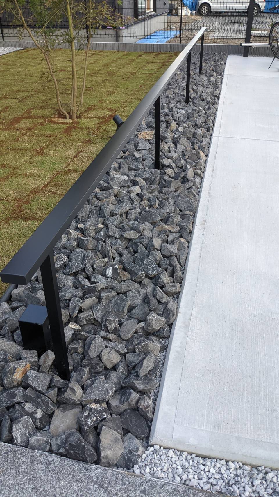 新築の外構工事になります。 一部コンクリート打設とお庭を全体的に防草対策として防草シートと砂利敷きを施工しました。 道路側は十分な高さでメッシュフェンスを設置しました。