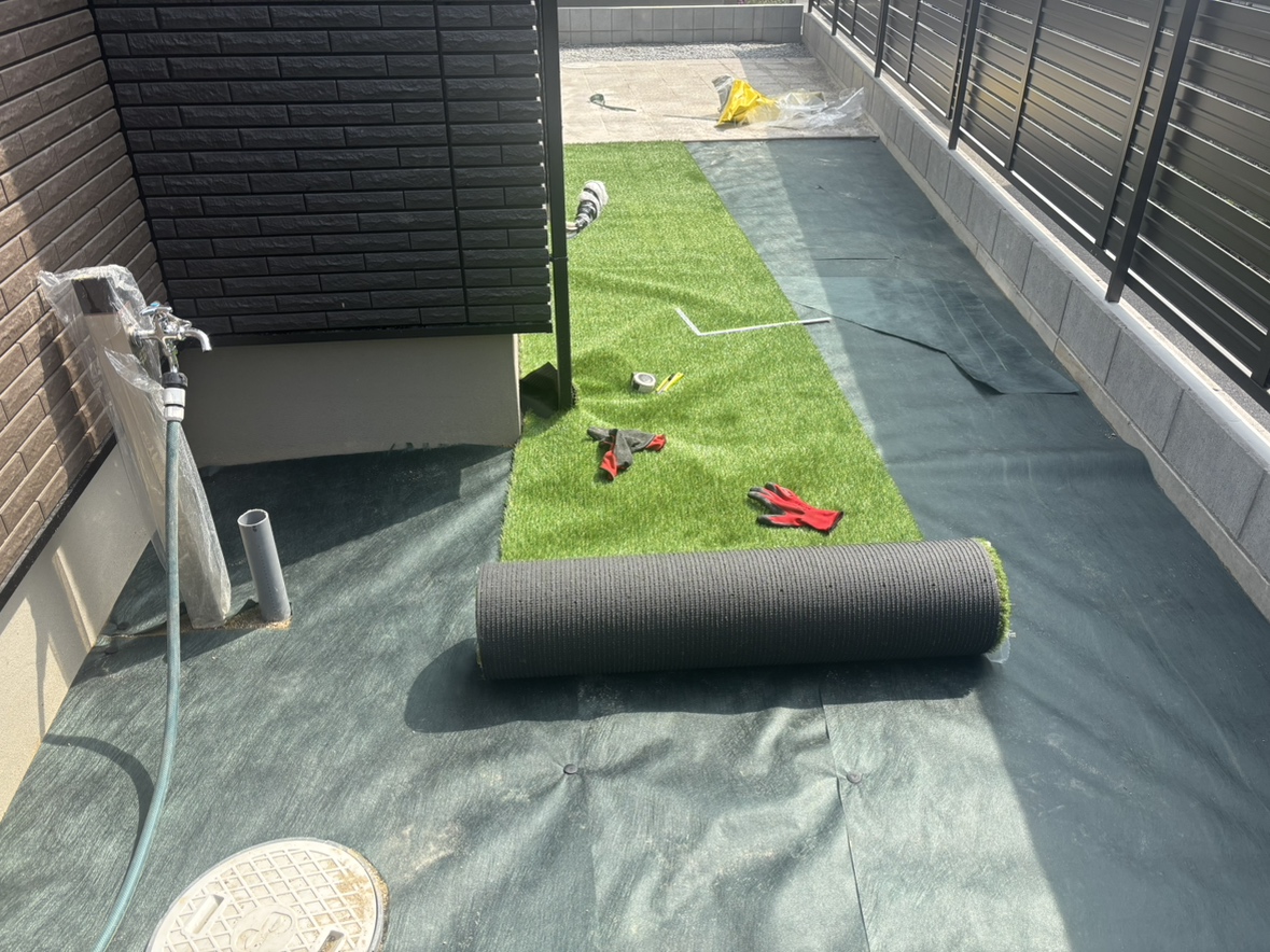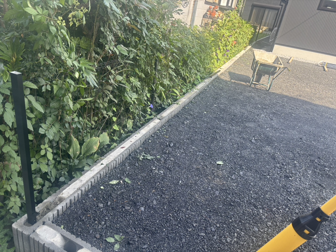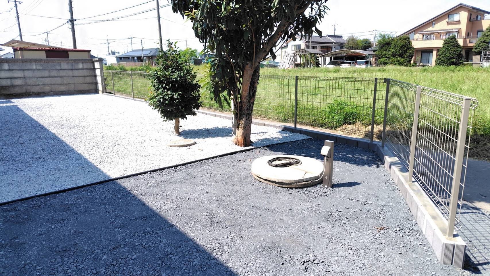 お庭を全体的にコンクリートに仕上げました。 サイクルポートはサイドパネルも設置したので雨風を遮ることができます。